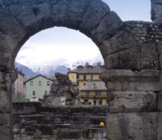 Aosta, ursprünglich Augusta Praetoria, wurde im Jahr 25 vor Christus von den Römern als Legionslager zur Sicherung des Übergangs über die Alpen angelegt. In der schachbrettartigen Anlage der Altstadt ist dies noch heute zu erkennen. Auch einige Gebäude, große Teile der Stadtmauer, einige Türme, das Stadttor Porta Praetoria, der Triumphbogen Arco d'Augusto, eine Brücke und Reste des Theaters sind erhalten.