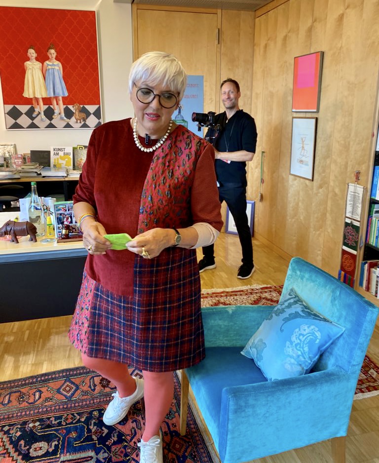 Bei einem Rundgang durch den Reichstag spricht er mit Vize-Hausherrin Claudia Roth über die Verbindung von Kunst, Politik und Vergangenheit. Claudia Roth ist Mitglied des Kunstbeirats. Dort wird über Neuanschaffungen beraten und abgestimmt der Kunstsammlungs-Etat des Deutschen Bundestags beträgt rund eine Million Euro pro Legislatur.
