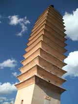 Die drei weißen, schlanken Pagoden des Santasi Klosters sind das Wahrzeichen der Stadt Dali im Westen Yunnans. Sie überragen die Yunnan-Guizhou-Hochebene und künden von der ehemaligen Bedeutung des Handelszentrums.
